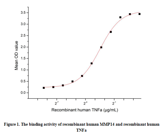 Matrix Metalloproteinase 14 (MMP14), also known as membrane-type 1 MMP (MT1-MMP), is a pivotal enzyme in the matrix metalloproteinase family. Unlike most MMPs secreted into the extracellular space, MMP14 is a transmembrane protease that anchors to the cell membrane. It plays a crucial role in degrading extracellular matrix (ECM) components, particularly collagen, thereby regulating tissue remodeling, wound healing, and developmental processes. Its ability to activate other MMPs, like MMP2, amplifies its proteolytic cascade. Importantly, MMP14 is a key mediator in cancer progression, facilitating tumor invasion, angiogenesis, and metastasis by breaking down physical barriers in the ECM. Its dysregulation is also linked to inflammatory and vascular diseases.Besides,Tumor Necrosis Factor Alpha (TNFa) has been identified as an interactor of MMP14, thus a functional binding ELISA assay was conducted to detect the interaction of recombinant human MMP14 and recombinant human TNFa. Briefly, biotin-linked TNFa were diluted serially in PBS, with 0.01% BSA (pH 7.4). Duplicate samples of 100μl were then transferred to MMP14-coated microtiter wells and incubated for 1h at 37℃. Wells were washed with PBST 3 times and incubation with Streptavidin-HRP for 30min, then wells were aspirated and washed 5 times. With the addition of substrate solution, wells were incubated 15-25 minutes at 37℃. Finally, add 50μl stop solution to the wells and read at 450nm immediately. Measured by its binding ability in a functional ELISA. When Recombinant MMP14 is lmmobilized at 2 μg/mL(100 uLwell), the concentration of TNFa that produces 50% optimal bindingresponse is found to be approximately 0.178 μg/mL.